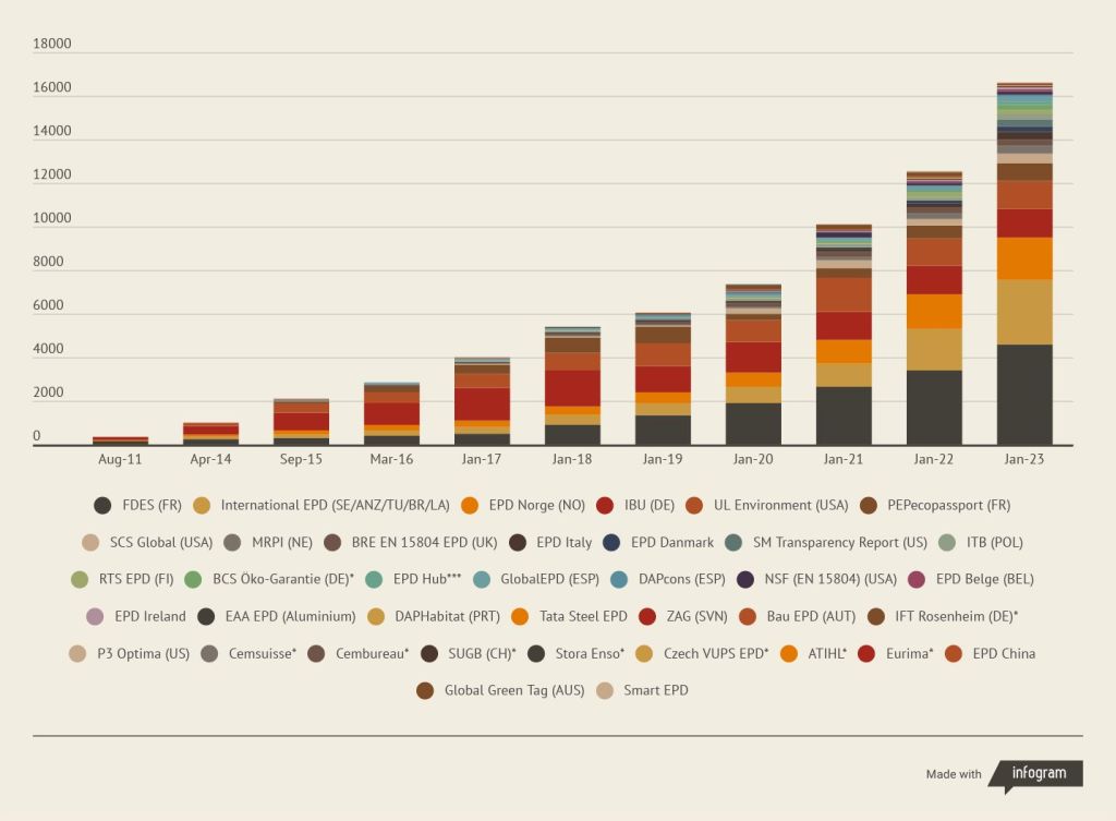 It’s been a while since my last post – I’m in the final stages of writing up my PhD so there’s not a lot of free time, but I have had time to update my EPD Infographic for the start of 2023, and I’m confident that there are now at least 130,000 EPD for construction products available globally, with more than 40,000 using EN 15804.