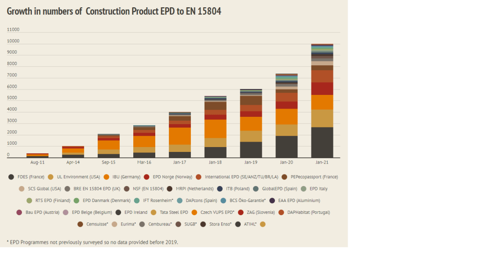 At the start of January 2021, there are just over 10,000 Verified Environmental Product Declarations (EPD) to EN 15804 for construction products registered globally, as shown in my 2021 Infographic.