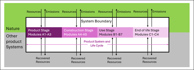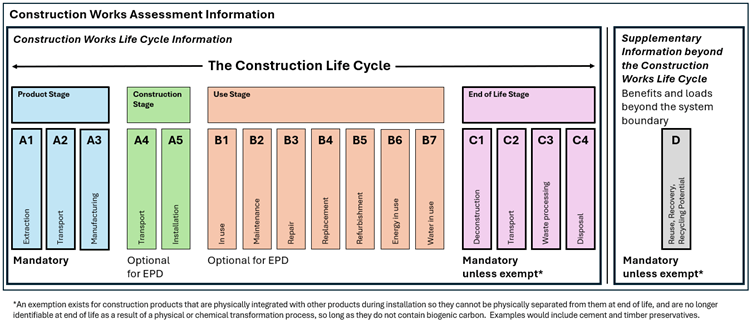 If you look at a construction product Environmental Product Declaration (an EPD for short), then you will see that the environmental impacts are broken down into life cycle stages and modules, as in Figure 1 below.